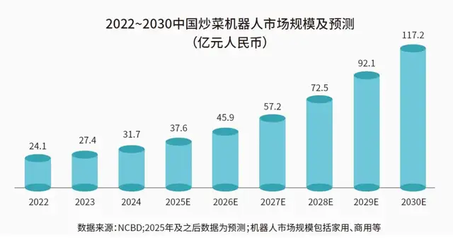 这些订单的增长,也必然带动企业对于产能的建设与投资。以上文炒菜机器人为例,中国食品工业协会发布的《世界炒菜机器人产业发展报告》显示,受餐饮行业自动化升级需求增加、中央厨房和连锁餐饮标准化运营的推动,中国炒菜机器人市场从早期探索到快速发展的阶段,到2025年,市场规模有望突破37亿元人民币,随后将呈现持续高速增长态势,到2030年将突破117亿元人民币。