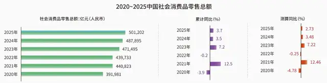 其中,消费仍然是全年经济增长的压舱石。2025年社会消费品零售总额501,202亿元,增长3.7%。“国补+以旧换新+服务消费券”组合拳带动了稳定的需求,尤其是2025年上半年增速可观,下半年消费者“观望情绪”加深、“换季需求”疲软,以及国补力度下降的情况下,整体消费也呈现下滑态势。