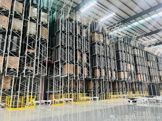 不再是传统仓库的“平铺直叙”,23米高的9层立体货架一路向上延伸,让1.8万㎡的空间足足创造了30000托盘存储库位。相比于传统平库,单位面积产出直接提升「4.5倍」,相当于用1块地的钱,办了4.5块地的事,彻底解决了“用地焦虑”。