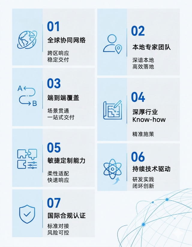 从初步接洽到深度信赖,关键在于能否提供经过验证的出海项目经验与符合欧洲本地标准与法规的设备资质。我们不仅提供定制化的自动化解决方案与系统集成,更将国内成熟经验与对欧洲市场要求的深刻理解相结合,确保从规划、实施到运维的全过程,都能贴合本地实际,助力客户高效、合规地建成并运营稳定可靠的智能工厂。